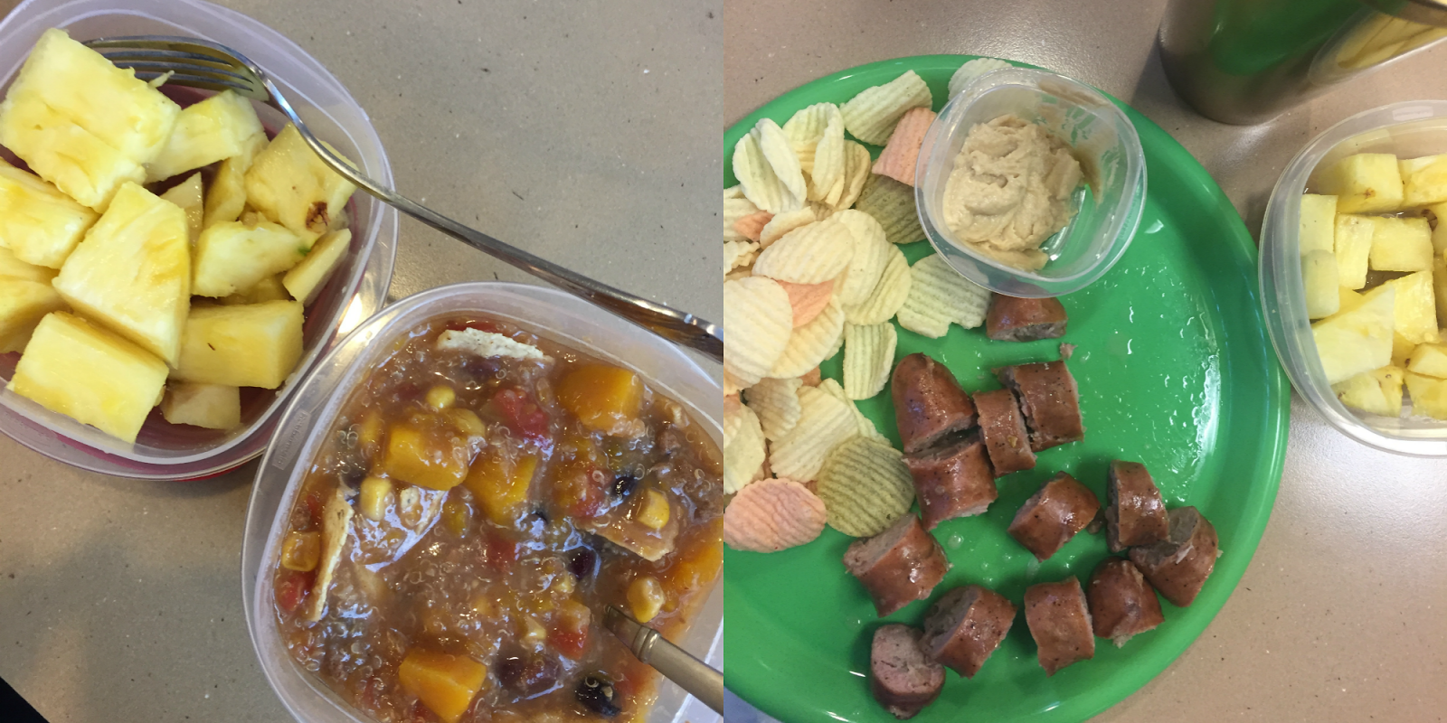 pineapple, butternut squash and quinoa soup / chicken sausage, veggie chips, hummus, pineapple